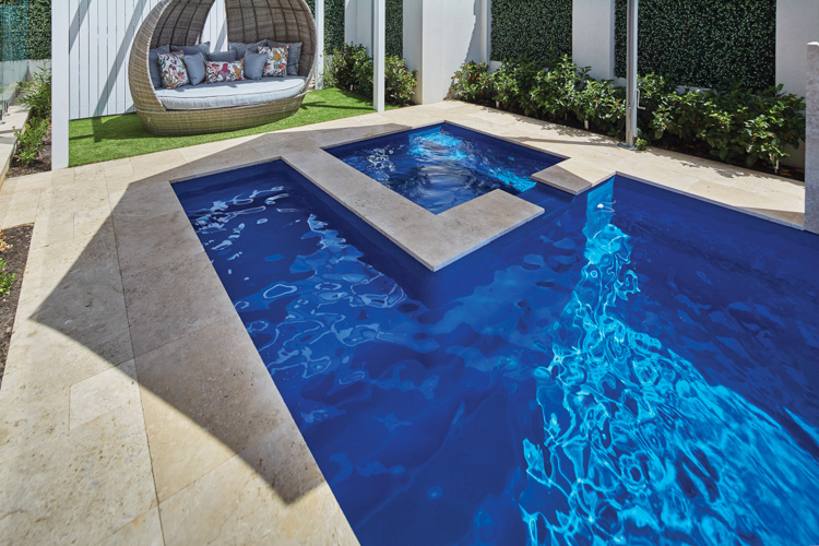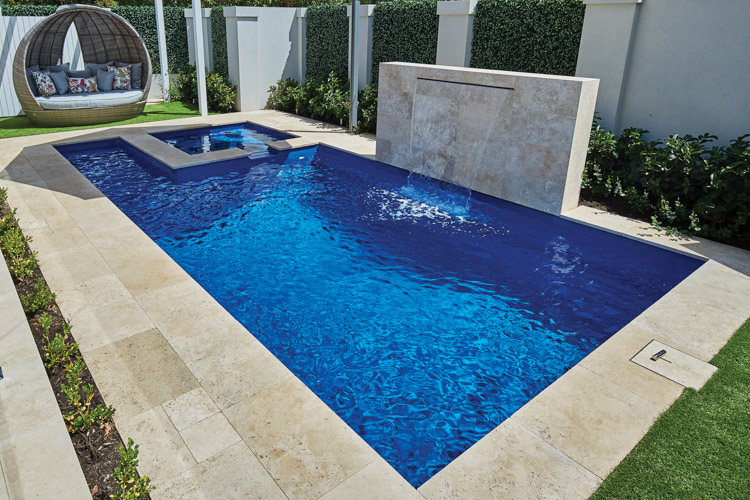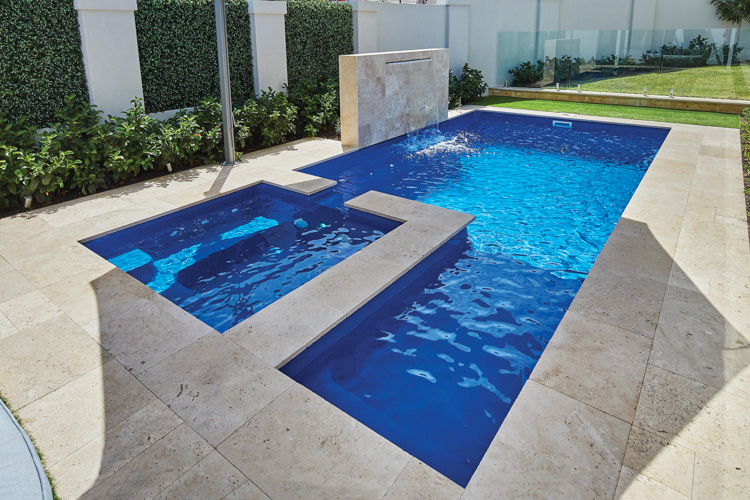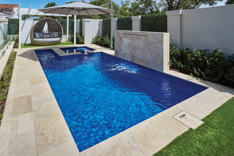 Immerse yourself in the luxury of the Coral Bay pool’s long bench seat, where you can relax and unwind while enjoying the tranquility of your backyard oasis. The pool’s thoughtful design includes a spillway, creating a delightful water feature that adds an element of visual appeal and serenity to your outdoor space.