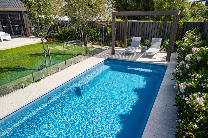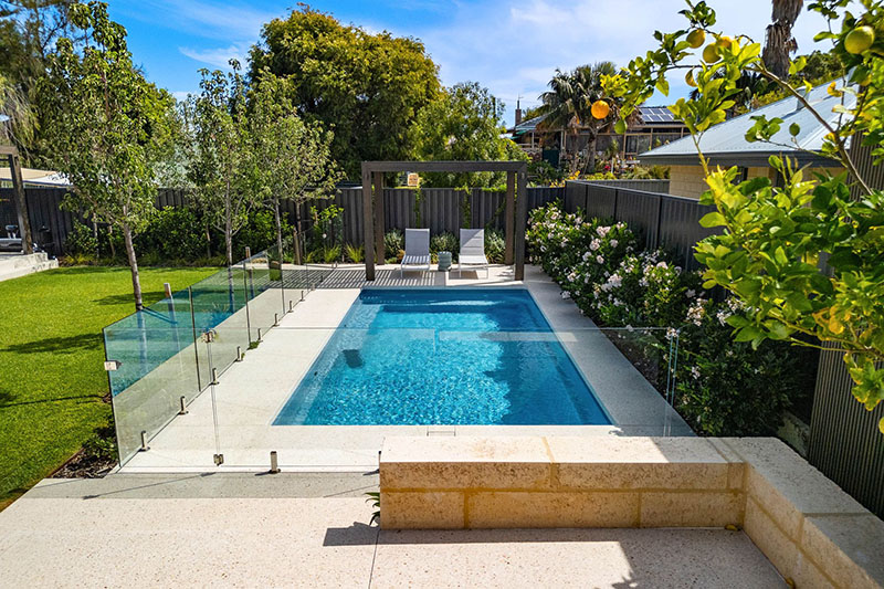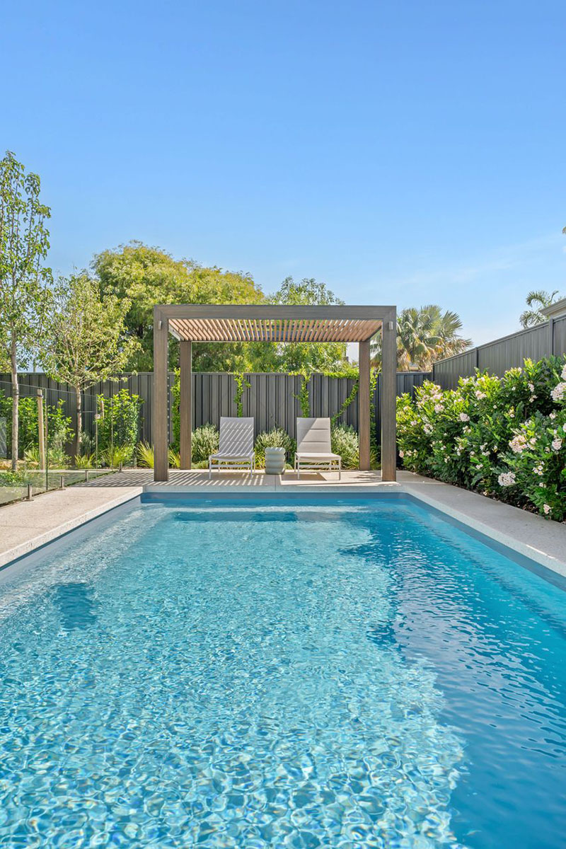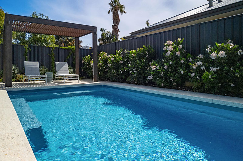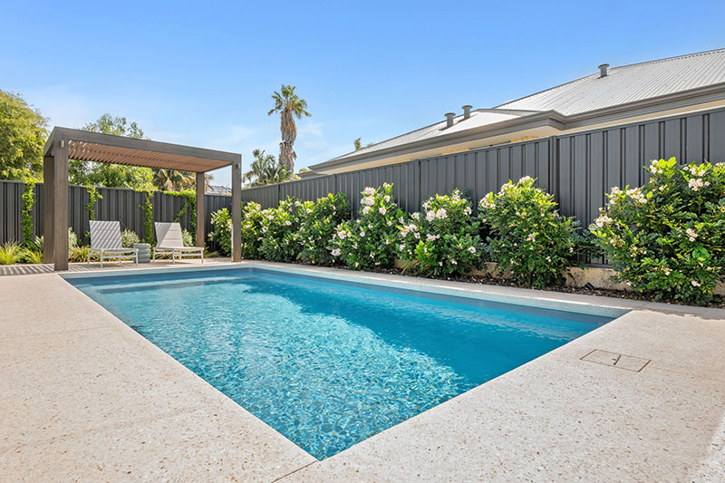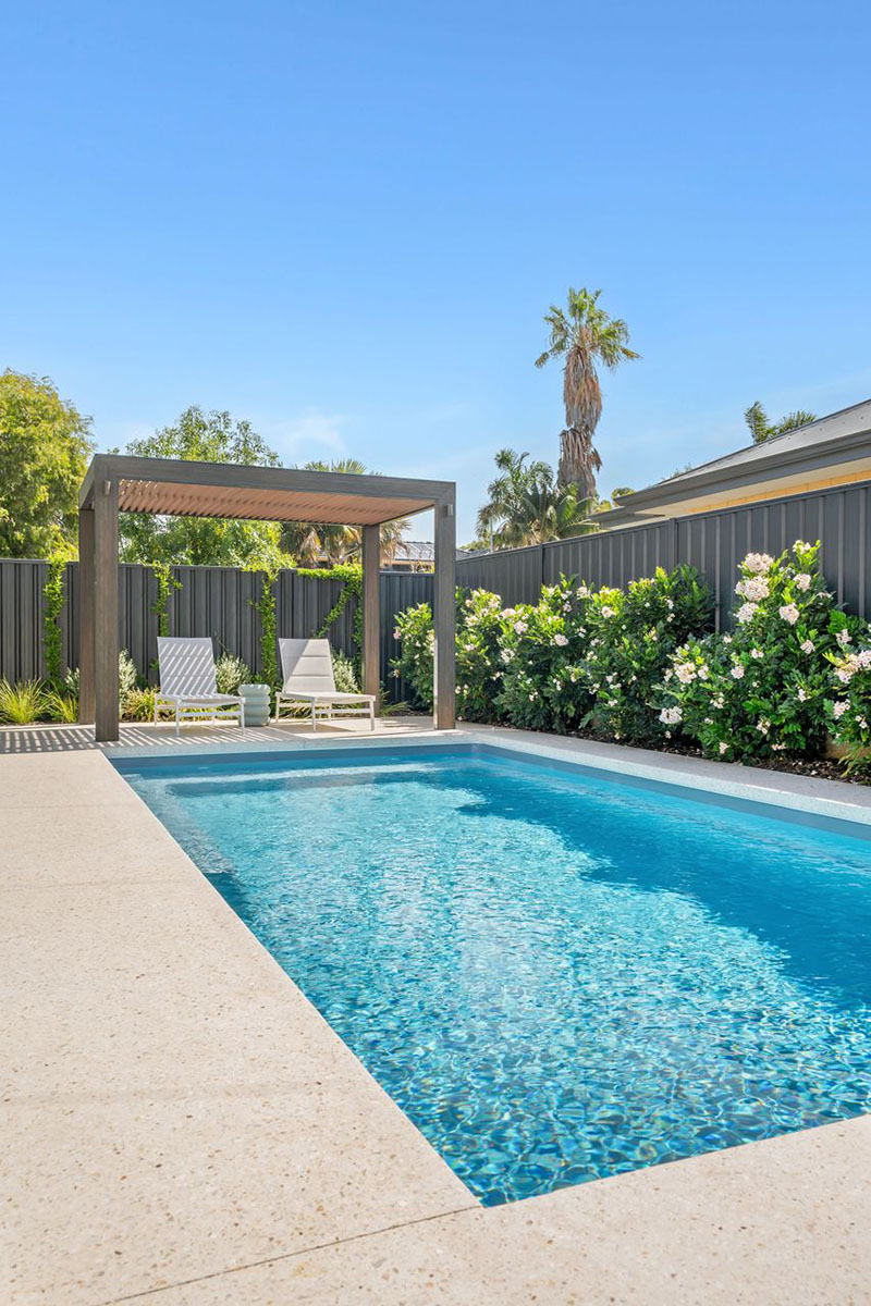 This 7.5m x 3.8m Billabong pool in Hampton Grey Shimmer brings a sleek, coastal elegance to this Safety Bay backyard. Its spacious layout offers plenty of room for swimming, relaxing, and entertaining, making it ideal for families and outdoor gatherings. The Hampton Grey Shimmer finish gives the water a cool, silvery-blue hue that beautifully reflects the natural light, complementing the laid-back coastal vibe. A stylish and functional addition, this pool is perfect for modern living by the bay.
