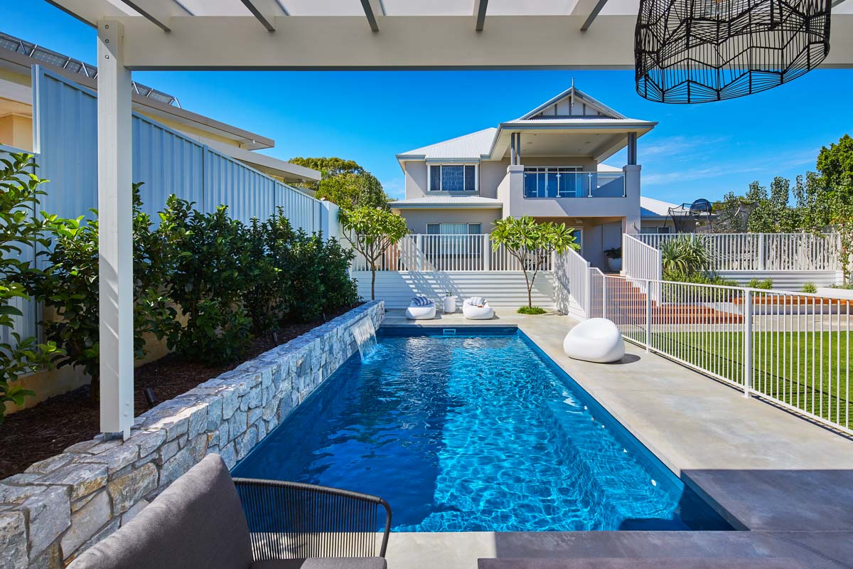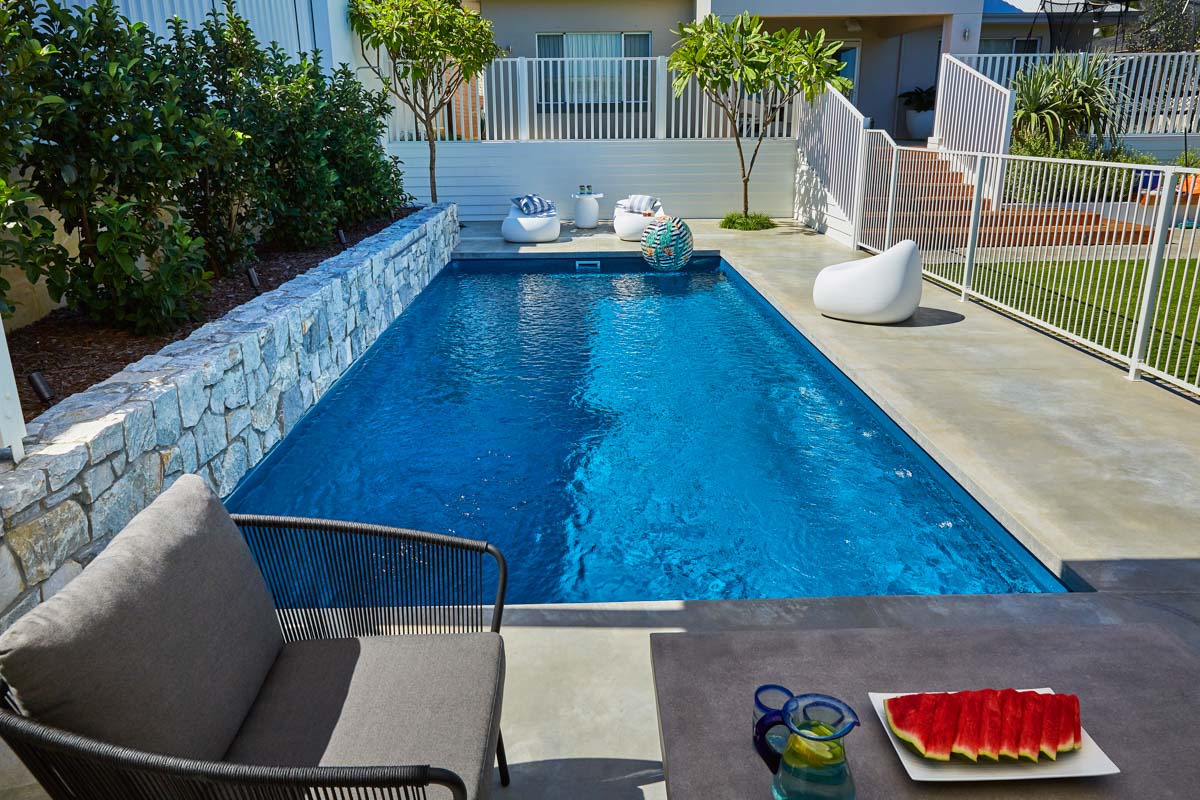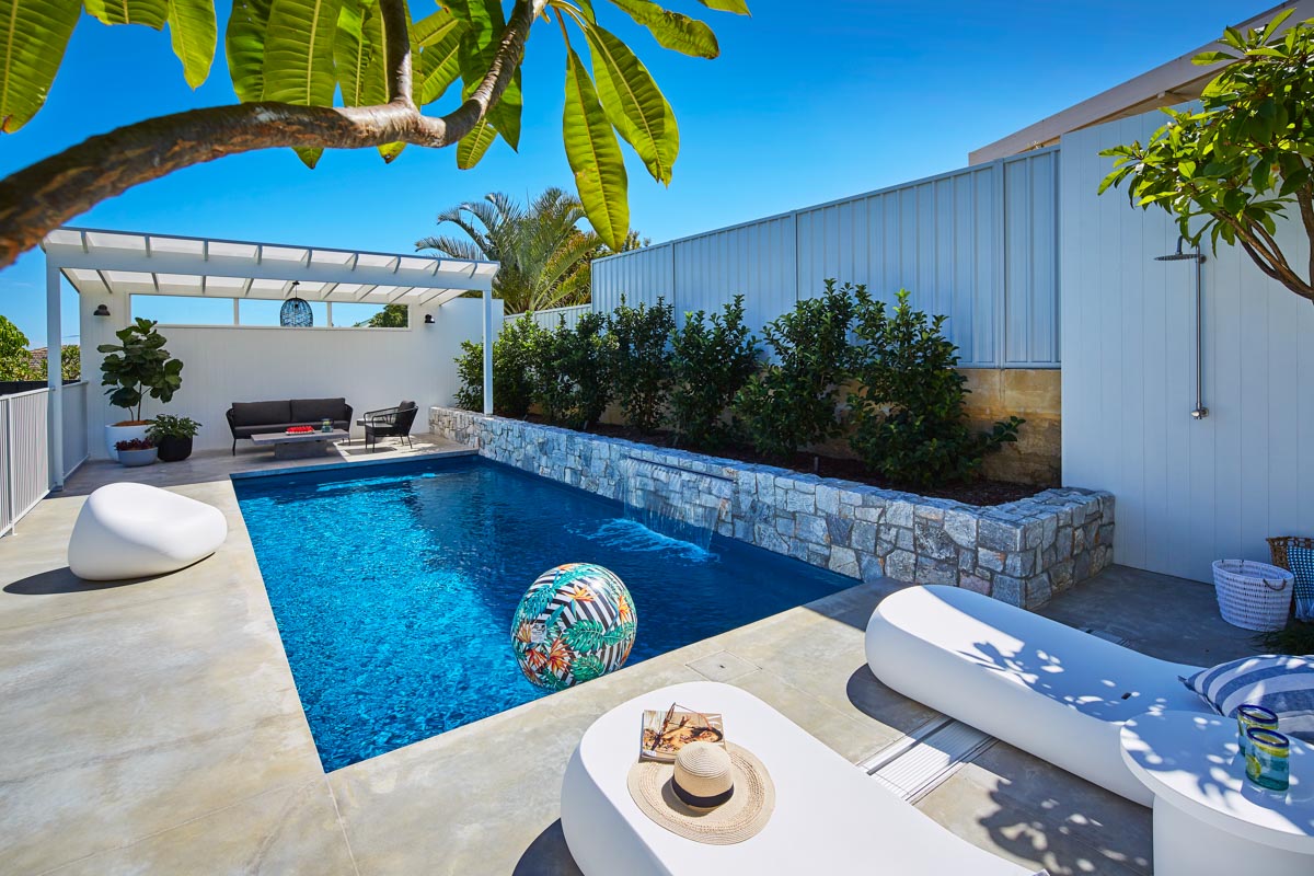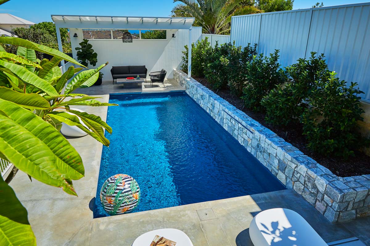 This Billabong pool installation uses a mix of contemporary elements, stone wall cladding, lighter pavers and plants to highlight the Royal Jade Shimmer pool colour. An idyllic paradise for the family, there’s no limit to how the pool space can be used. Make use of the shaded area at the back of the backyard and kick back and relax, or bask under the sun rays in the chairs on the other end. This Billabong pool is in a 8.5m x 3.8m configuration, perfect for medium to large backyards!