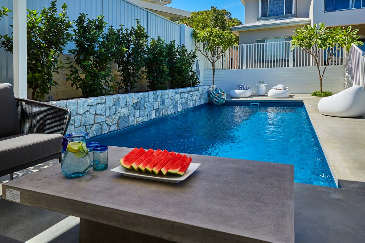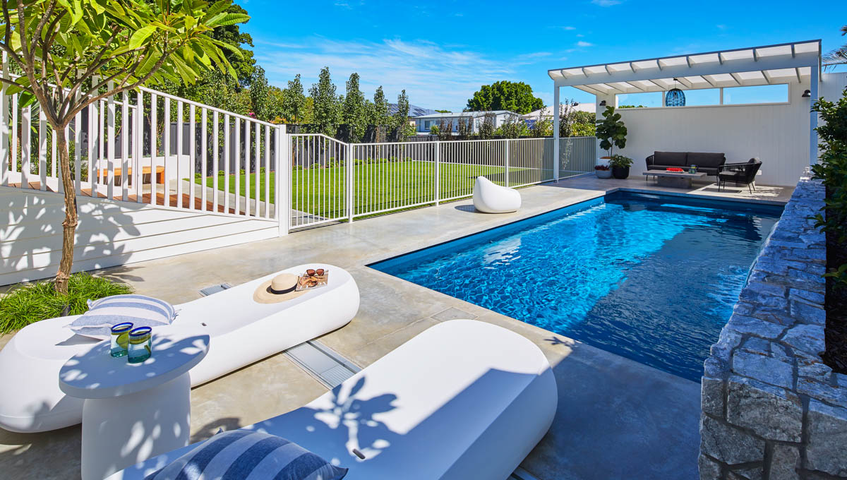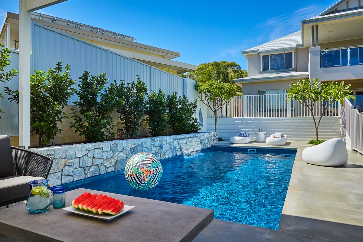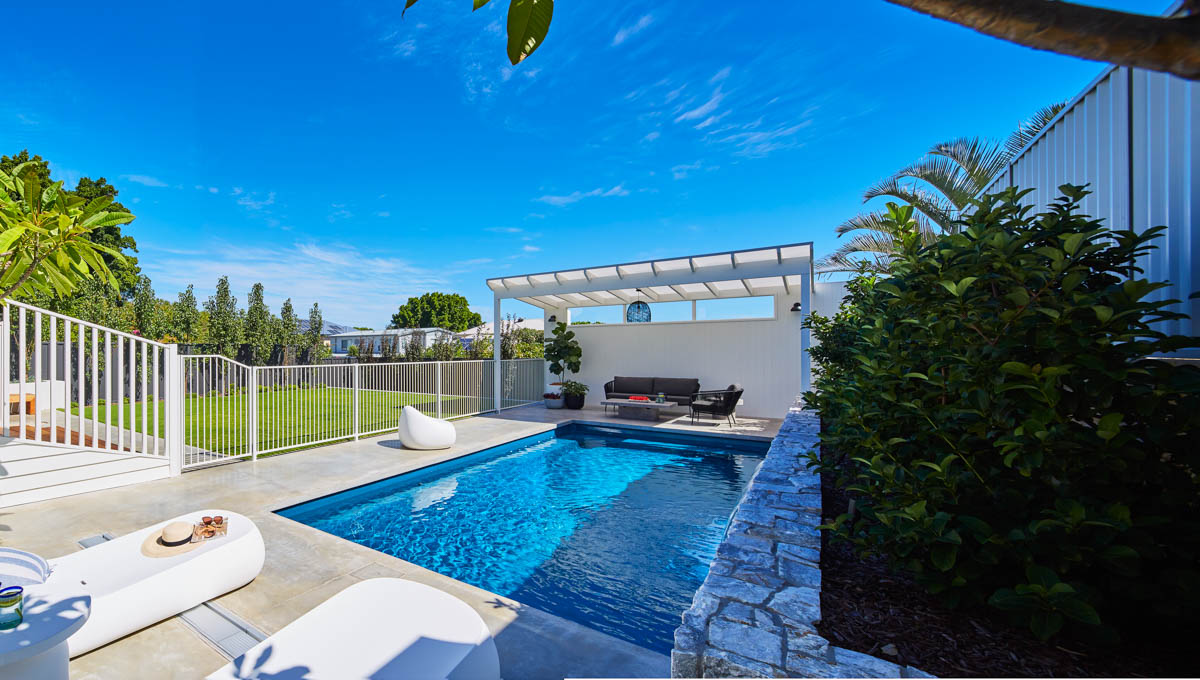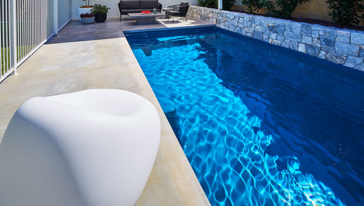 This Billabong pool installation uses a mix of contemporary elements, stone wall cladding, lighter pavers and plants to highlight the Royal Jade Shimmer pool colour. An idyllic paradise for the family, there’s no limit to how the pool space can be used. Make use of the shaded area at the back of the backyard and kick back and relax, or bask under the sun rays in the chairs on the other end. This Billabong pool is in a 8.5m x 3.8m configuration, perfect for medium to large backyards!