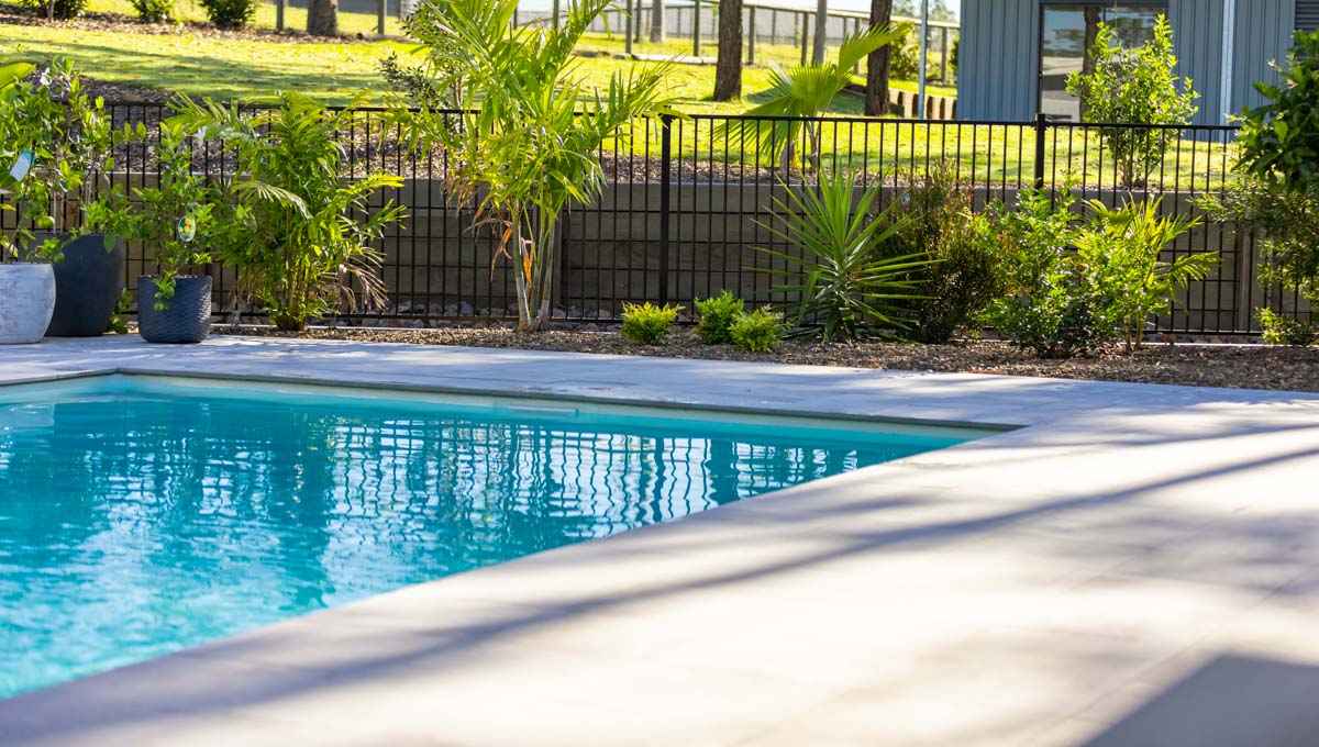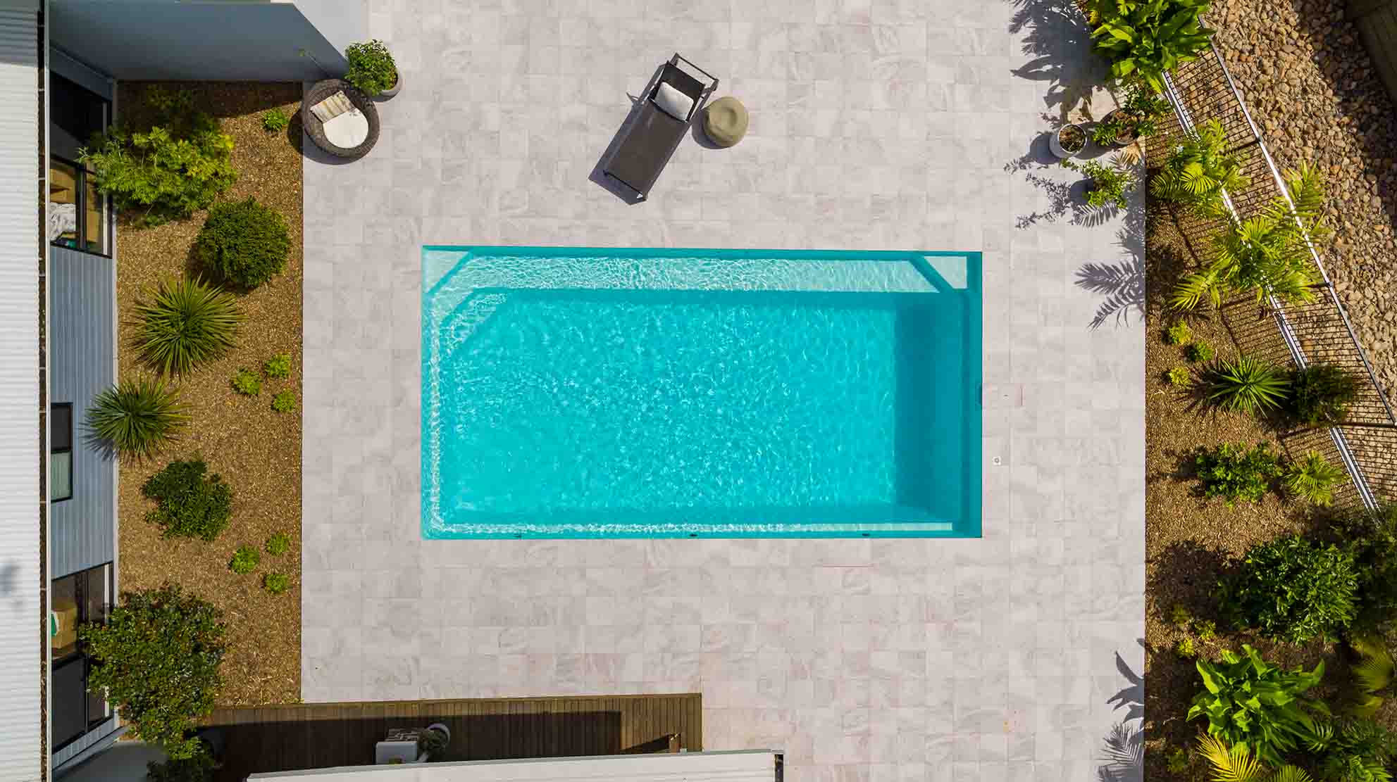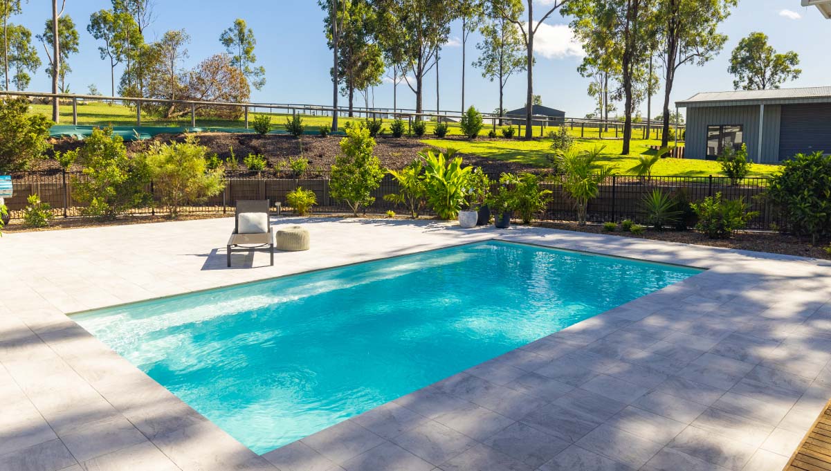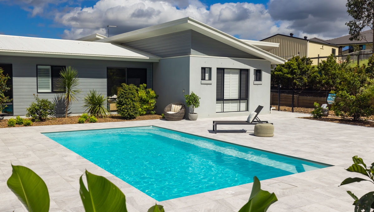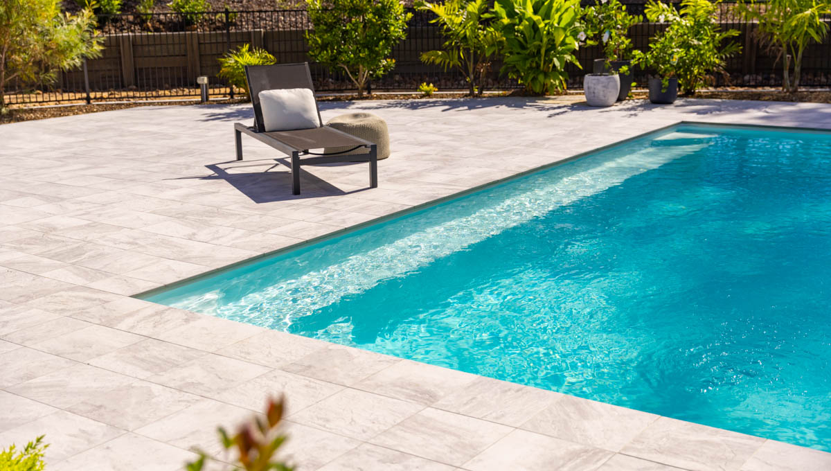 Introducing the Brampton 10.1m x 4.4m pool in Royal Alpine White Shimmer, showcasing striking geometric features that beautifully complement both modern and timeless landscapes.