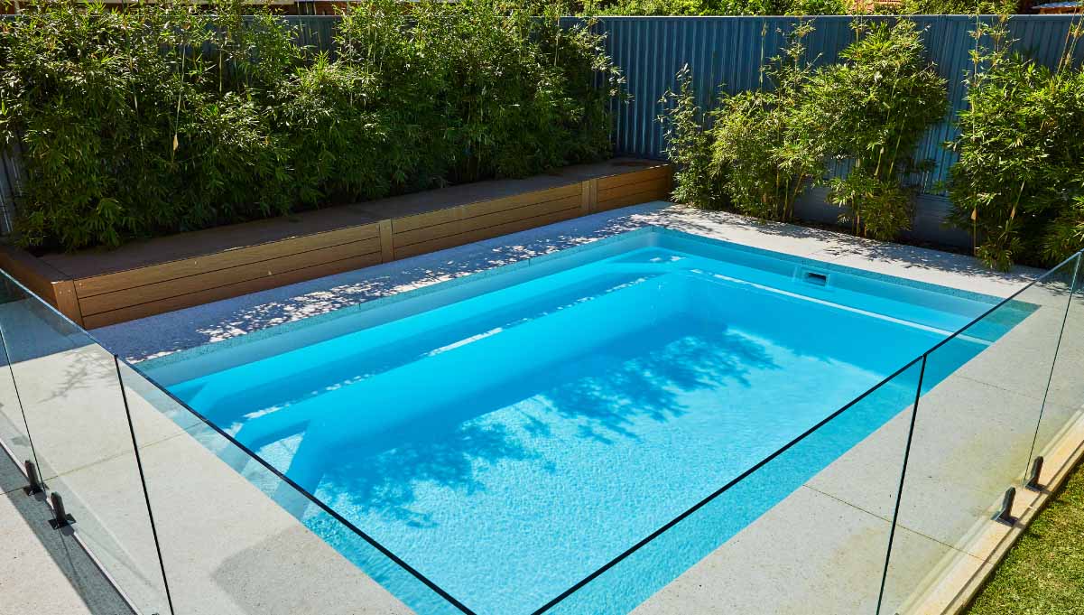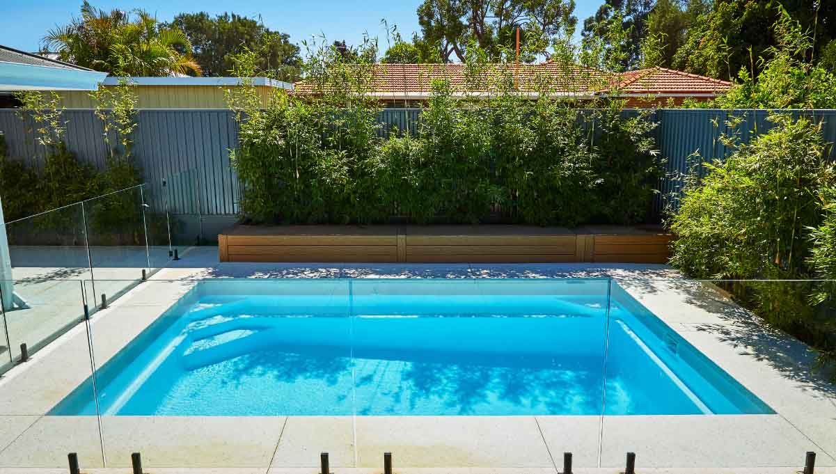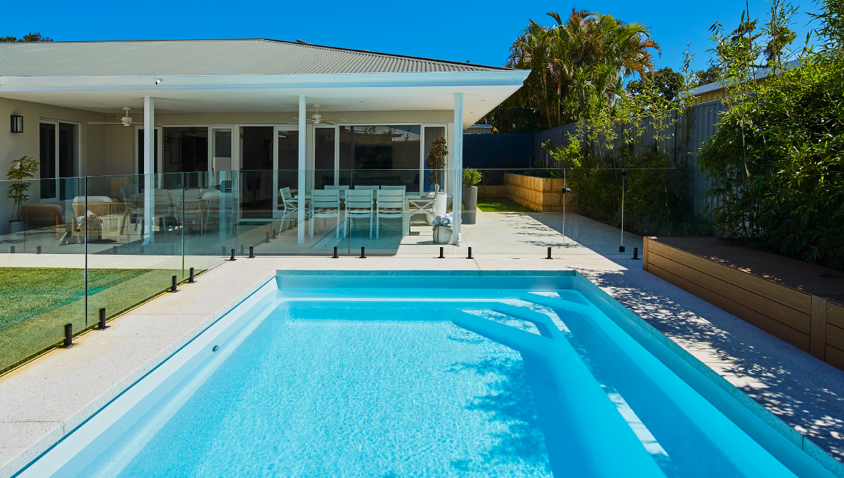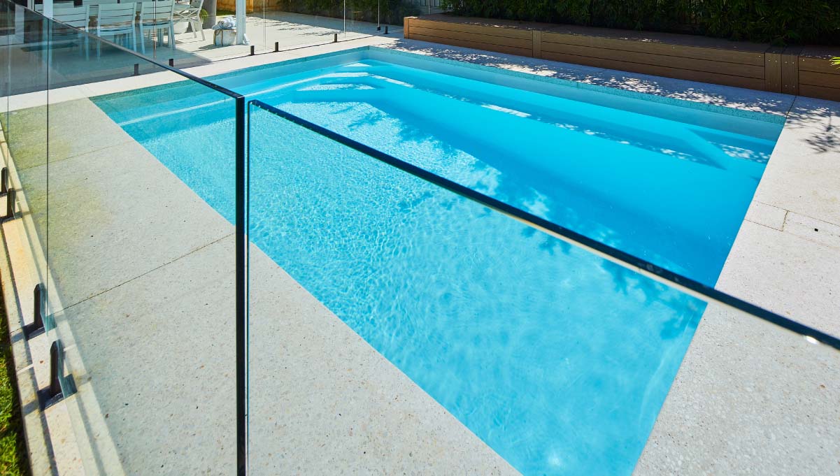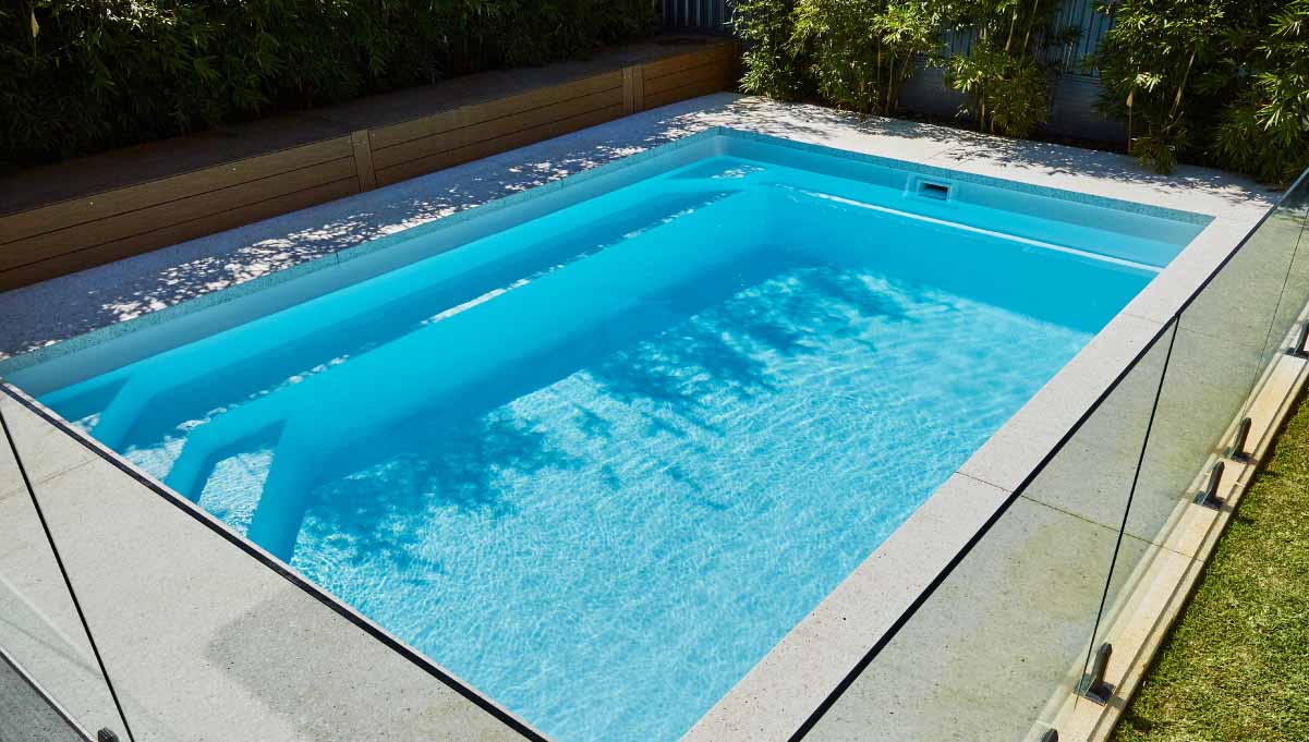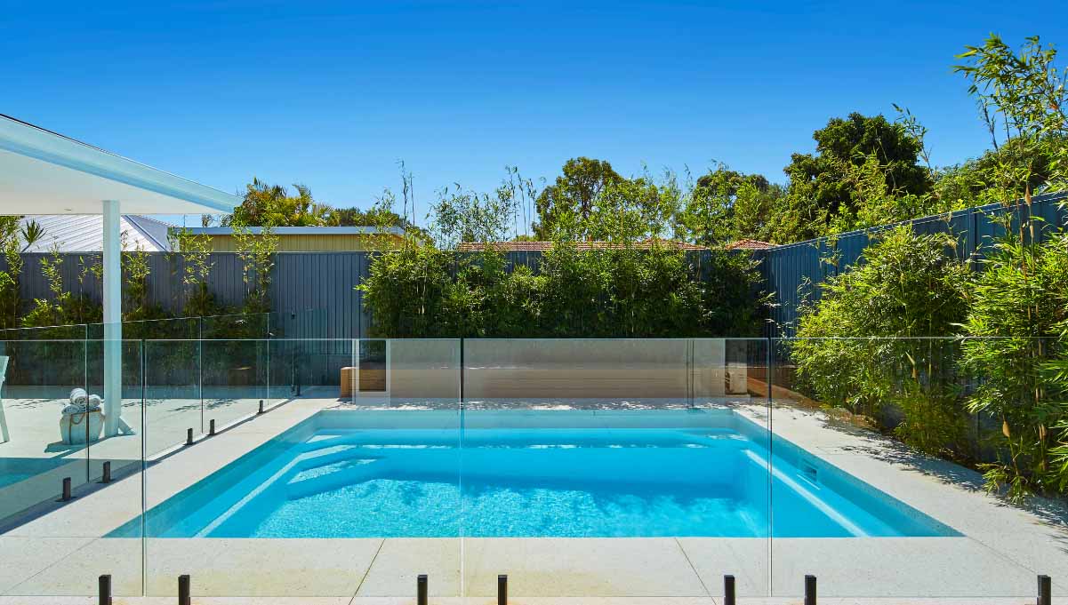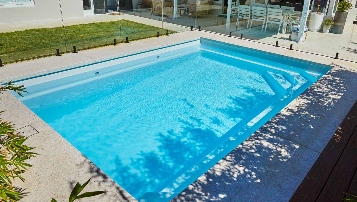 Introducing the Brampton 6.2m x 4.4m pool in Royal Alpine White Shimmer, showcasing striking geometric features that beautifully complement both modern and timeless landscapes.