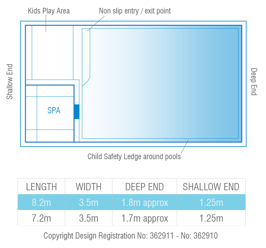 Designed with dual spillway’s the pool & spa can run simultaneously eliminating any additional power costs, alternatively, they can be run independently. The generous swimming area has been designed to be totally un-obstructed, which is ideal for swimming laps and active families. There is no other pool that can offer all of these features. With its square lines, designer looks we are sure your whole family will love it.